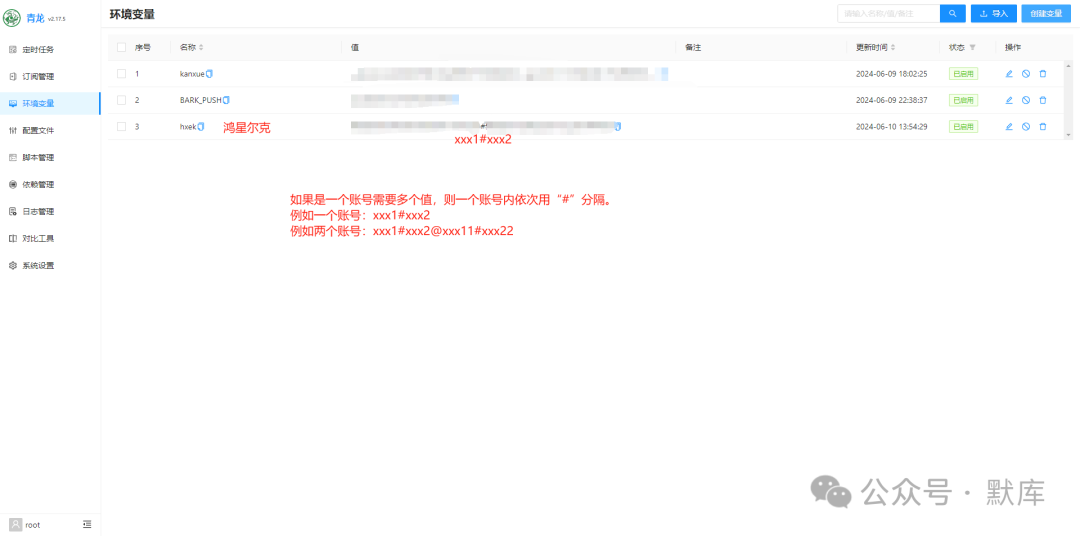 2. 值填账号cookie。多个账号之间以"@"分隔。如:账号1@账号2@账号3