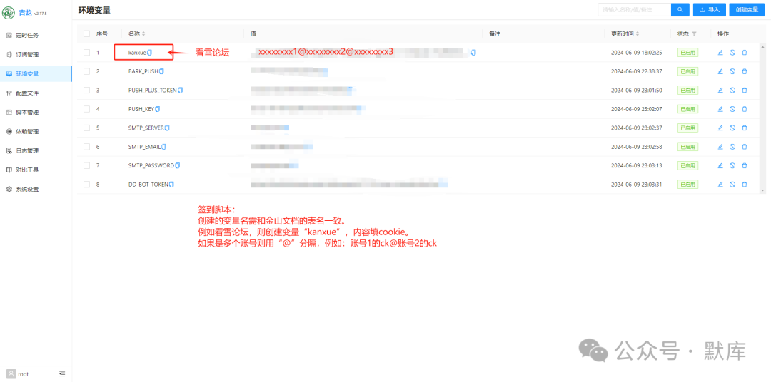 1. 环境变量的命名和金山文档的表名一致,值填cookie。如变量名为:"mouxue",代表某雪论坛。