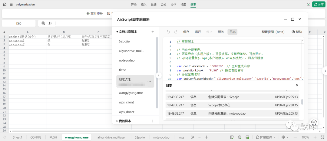 2.将复制的UPDATE.js代码粘贴到脚本编辑器中,点击"保存",再点击运行。当UPDATE脚本运行完后,会自动生成配置表格。