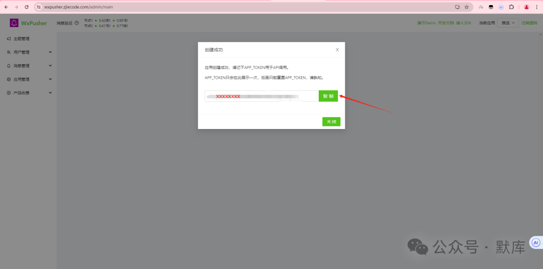 创建推送应用,并复制apptoken,如apptoken