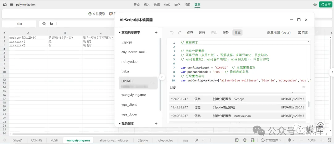 1.进入github中复制最新的UPDATE.js的代码(此为更新脚本,运行则会自动新增表格配置、不会覆盖原有信息)